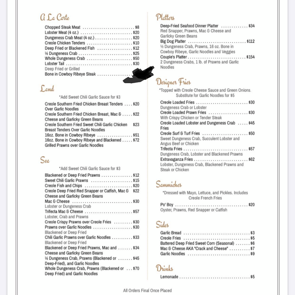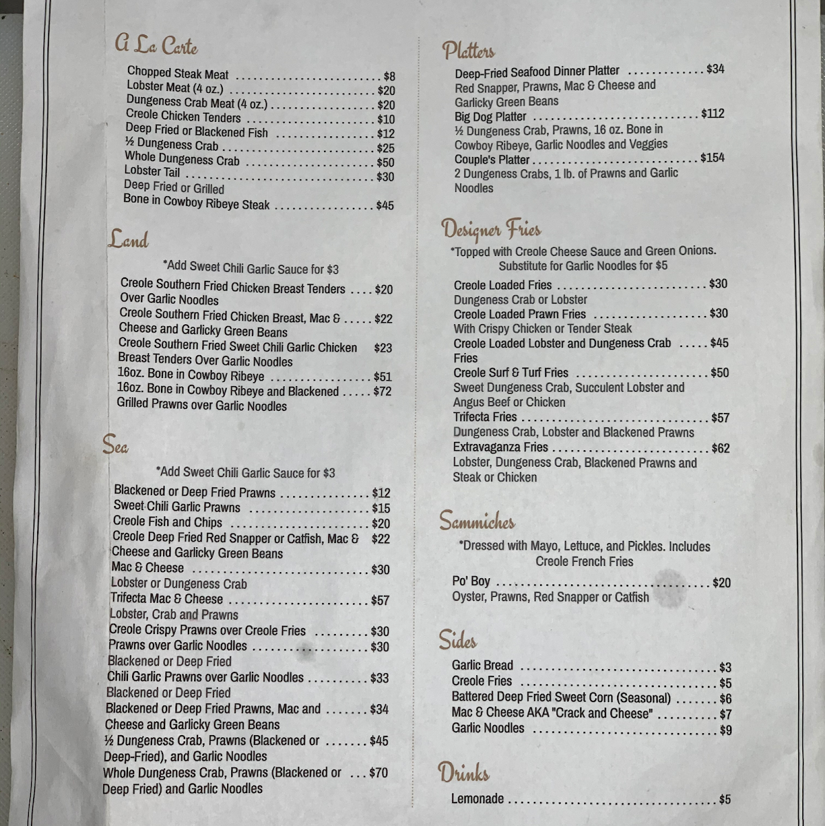 Now, let’s talk about the showstoppers on the menu! For seafood lovers, don’t miss out on their Deep Fried Sea Bass served with two sides, a Playoff special priced at just $50.00. If you’re in the mood for something indulgent, their Trifecta Fries—tantalizingly topped with Dungeness crab, lobster, and blackened prawns for $67.00—are a must-try. Each bite is a melody of textures and flavors, making it an unforgettable dish that elevates the ordinary to extraordinary.